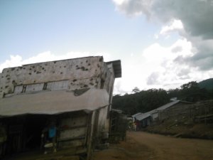 Zar Zar, the town we stopped in, of which the cook at DEN-L is a native, had at one time been headquarters for one of the many rebel movements in Liberia. In fact, explained the driver, “Lar Rebel,”* who was the leader of the Mandingo affiliated movement, drove Charles Taylor out of Lofa, or at least out of Zar Zar. And it shows. I tried to get some shots of the bullet holes because I think it’s telling about the war. Remember, 14-15 year war, 2-3 year spurts, country wide. That means every single building built before the end of the war has bullet holes in it. Some of these buildings are still in use, some are burnt out shells, some have been gracefully repainted to hide the tiny indents. The devastation that must have been commonplace until the final ceasefire is hard for me to imagine. But maybe I don’t want to. Despite what I can only imagine traumatized the nation, people are hopeful. They’re rebuilding, constantly, and using what’s left in some instances to build off of and in some to remember. People on the streets wave at passing cars, not because they know someone in it, and not because there’s a white woman in it, but because they made eye contact with the driver or a passenger. There’s also a habit of, if you see a problem, fix it, because the government sure won’t. For instance, the timber industry leaves a lot of people waiting for their pick up at the side of the road. At these points, people have constructed lean to’s as a kind of bus stop. These structures are solid, even if they aren’t made with two by fours but branches.