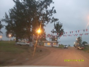 Picture 1 is our cook, Alice, who is very sweet and works very very hard. The next photo is in Gbarnga, it’s the new bank that was prepared for the Independence day celebration, you can’t really see it but in there is a “wacky wavy inflatable arm flailing tube man” that made many many people stop and stare. Yes, it’s air that’s keeping it up. The next photo is of the presidential house that i first took a photo of with the burned out guard center. You can see some progress, but it was getting dark. The last picture is of a women’s group that B’s a part of that pulls money together and supports each other when something bad happens, which seems to happen a lot.